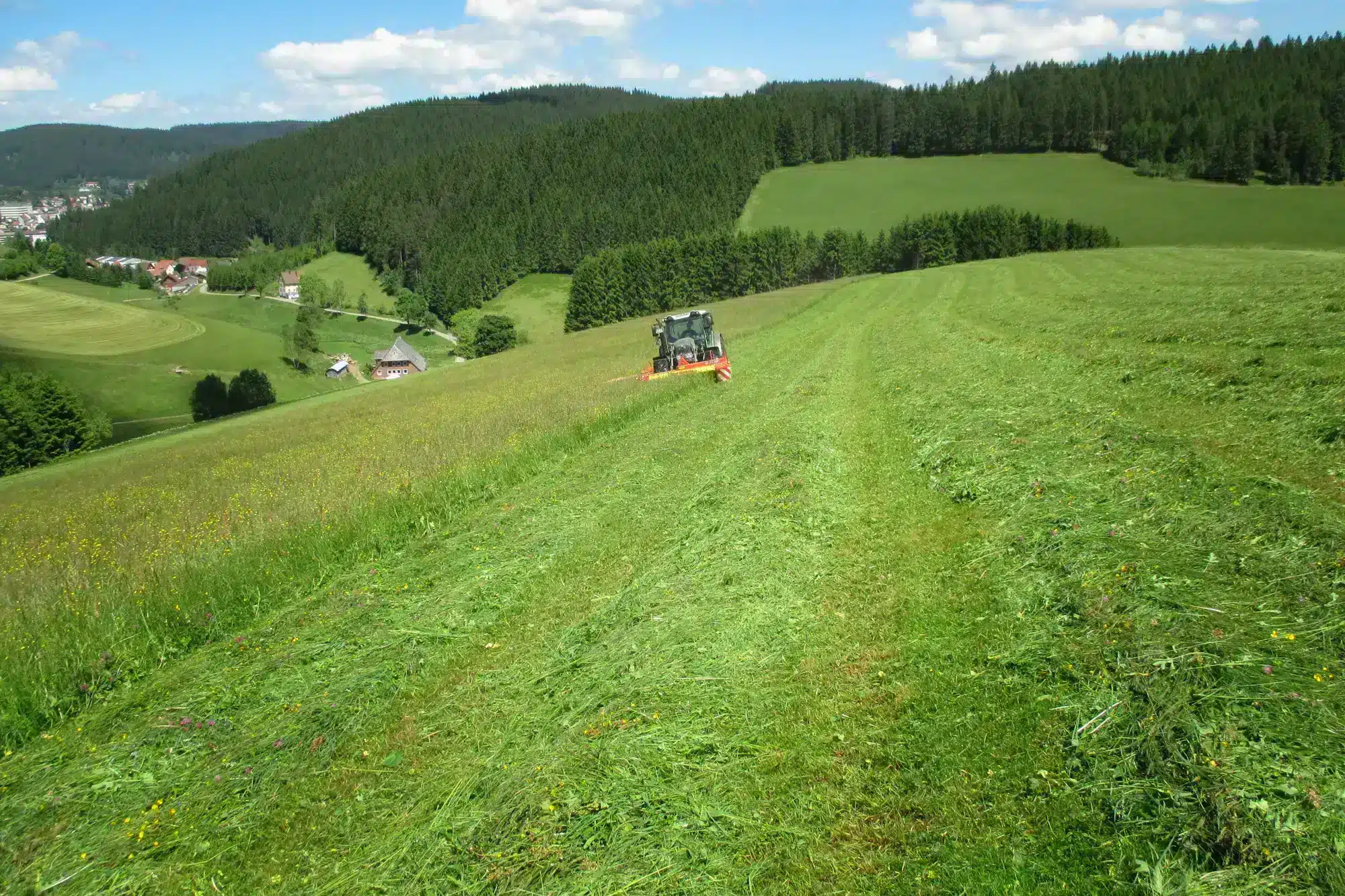 Das Gras wächst in einer Höhenlage von 900 – 1000 Meter, an den Berghängen des „Naturparks Südschwarzwald“. Gegenüber anderen Regionen können wir im Bergland mit dem 1. Schnitt erst später beginnen, in der Regel meistens im Juni. Infolge der extensiven Bewirtschaftung entsteht auf unseren Wiesen eine bunte Vielfalt an Gräsern, Blumen und Kräutern. Eben, jener Leckerbissen für deine Lieblinge.